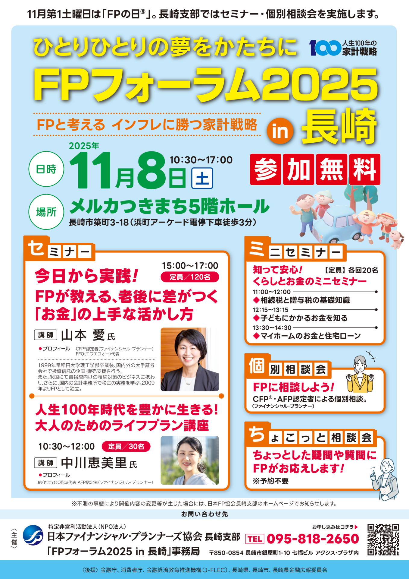 【保有資格】・日本ファイナンシャル・プランナーズ協会認定AFP・IFA(独立系金融アドバイザー)・証券二種外務員資格・公的保険アドバイザー・住宅ローンアドバイザー◾️長崎商工会議所専門家派遣制度・エキスパートバンク登録◾️長崎市こころ未来高校/選択科目・ファイナンシャルプランニングコース講師