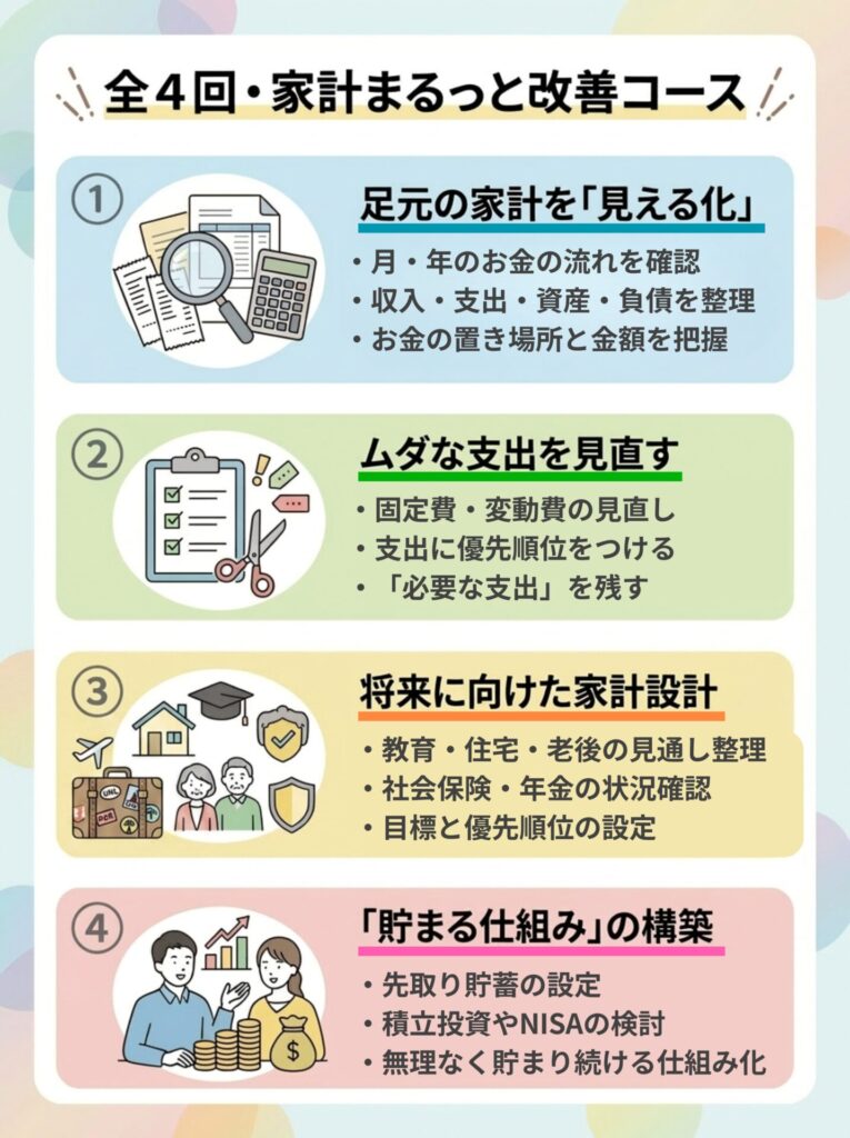 このコースでは、家計の一部だけを整理するのではなく、今の状況を一つずつ整理しながら、将来まで見通せる形に整えていきます。